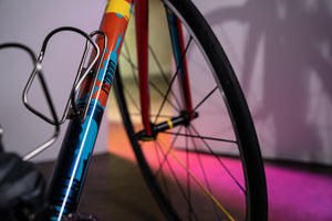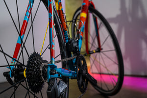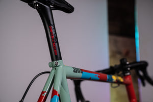 Not only was he a good friend, but he’s also a previous owner of numerous exceptionally expensive bikes with creative paintwork. On top of all of that, he also knows the difference between a Rothko, an Ellsworth Kelly and a Park McArthur. It won’t come as too much of a surprise to find out that he “hates boring bikes” and, as this was a Columbian-made race bike heading to California to live, a paint concept that combined the work of a Colombian and a Californian artist began to emerge. CA artist Richard Diebenkorn’s Ocean Park #79 was referenced, as was the geometric work of Colombian artist Omar Rayo. The art was finalised and the painting was executed in-house which, apart from the design, is standard procedure for Scarab.